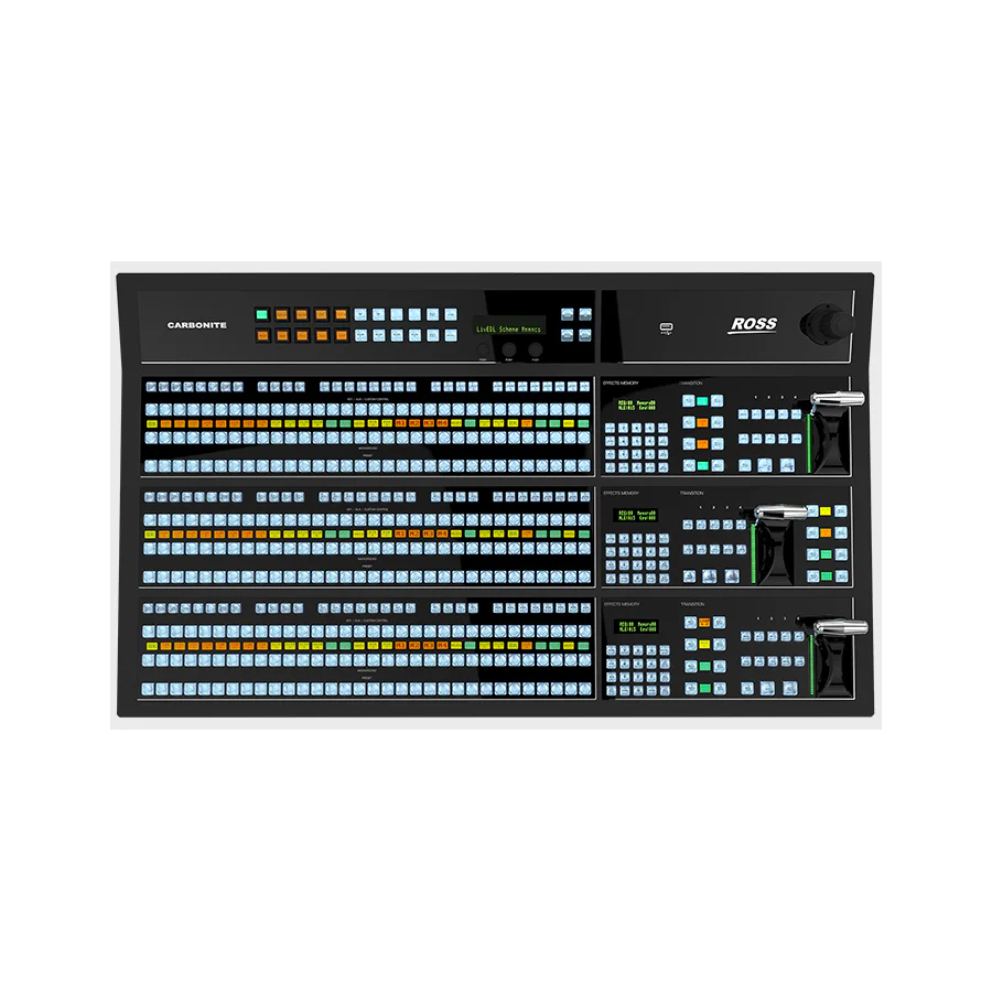 The Carbonite Black 3X panel is the flagship of the Carbonite line, it is great to look at and a joy to operate. The CB3X has Acuity style faders and dedicated 32 button source select rows, it also has dedicated ME row selection buttons for instant control of any ME or MiniME on any row as well as 8 Custom Control bank select buttons, allowing a whopping 256 Custom Control Macros to reside on the panel for direct selection at any time. This panel connects to Carbonite frames via Ethernet and not the PSL (Panel Serial Link) port, providing control over much greater distance.